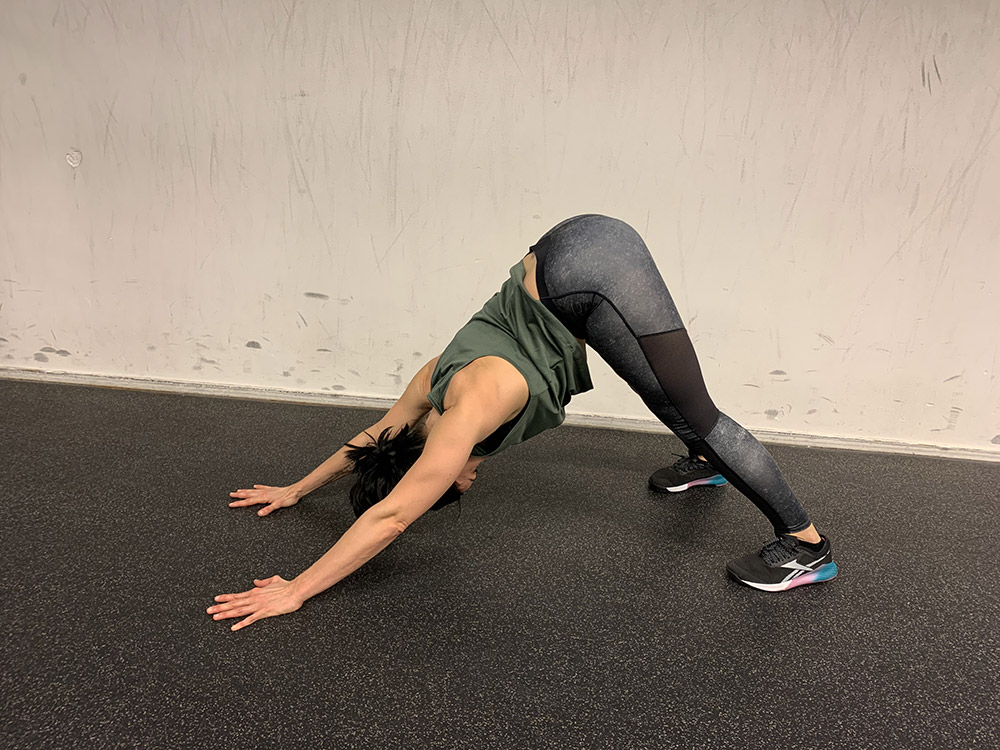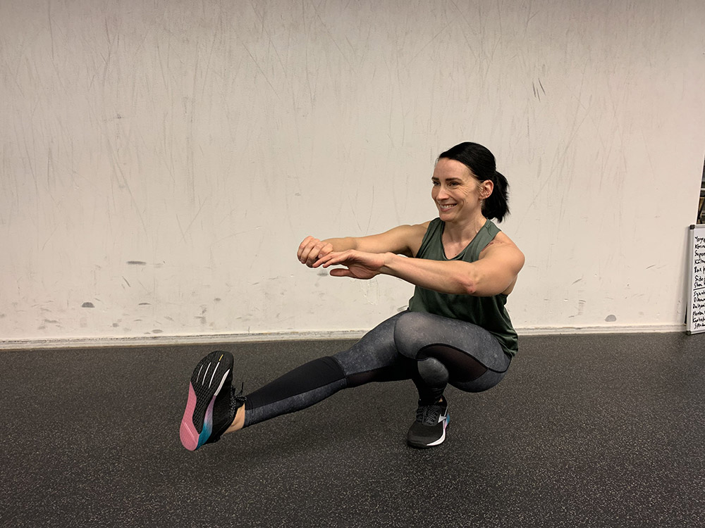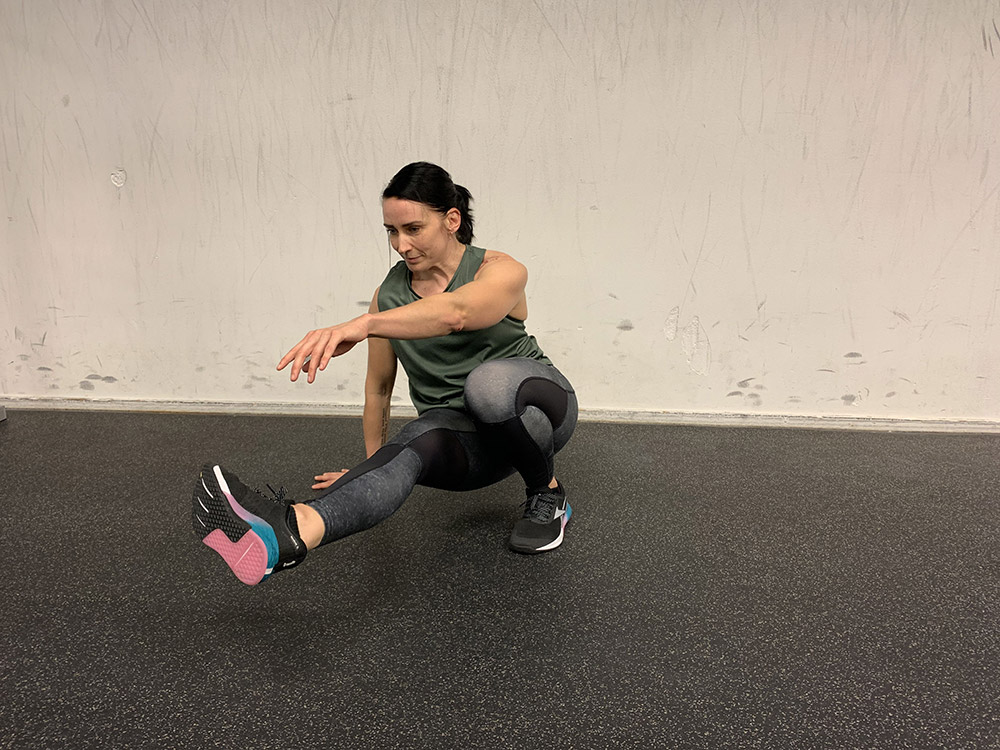 Tänk på: Håll benet du sträcker fram i luften hela tiden så att du inte sätter hälen i golvet. Försök att inte sätta i någon hand i golvet.