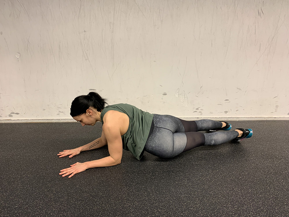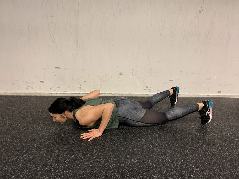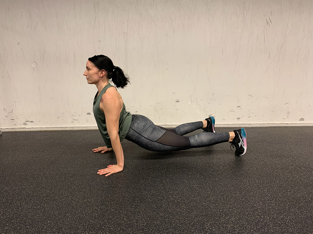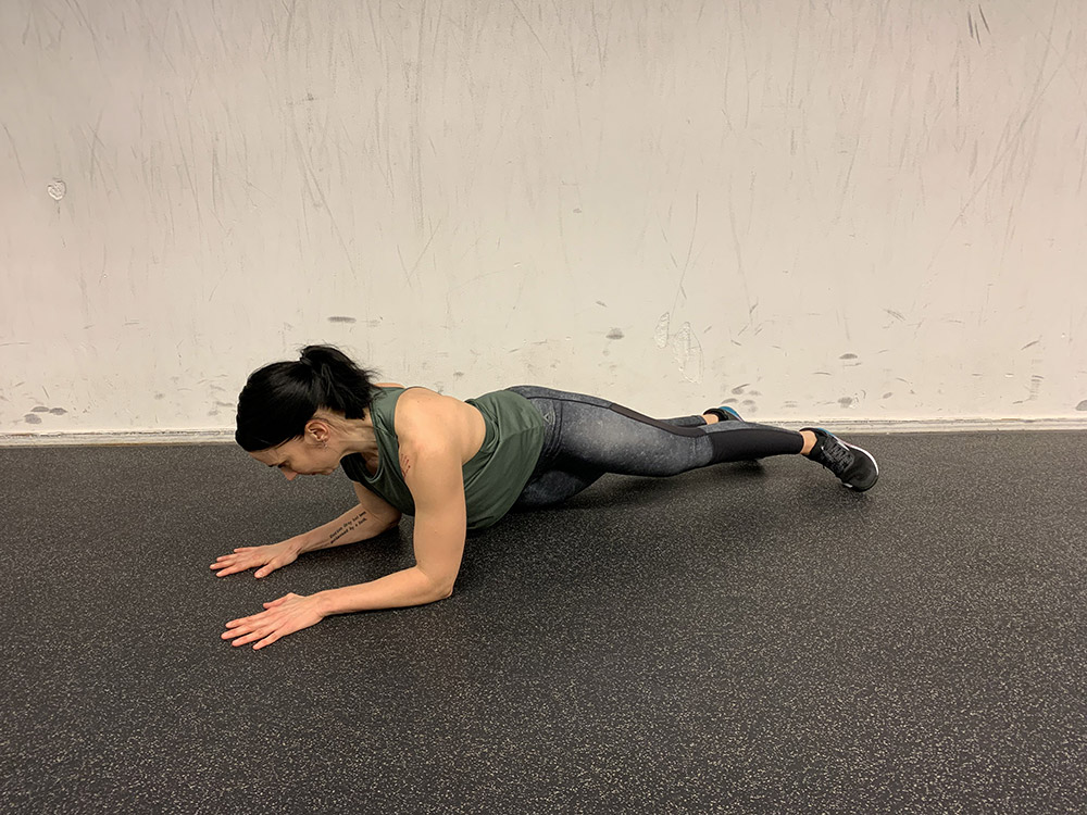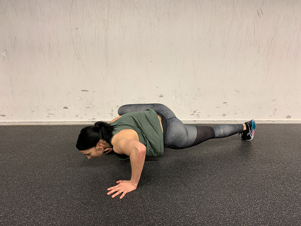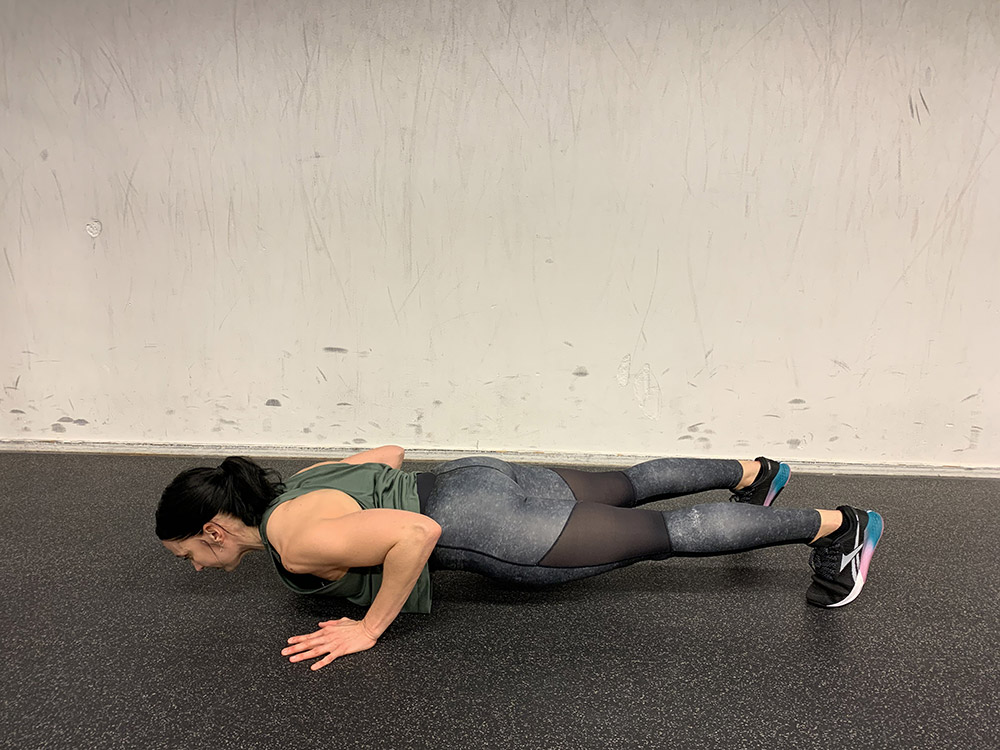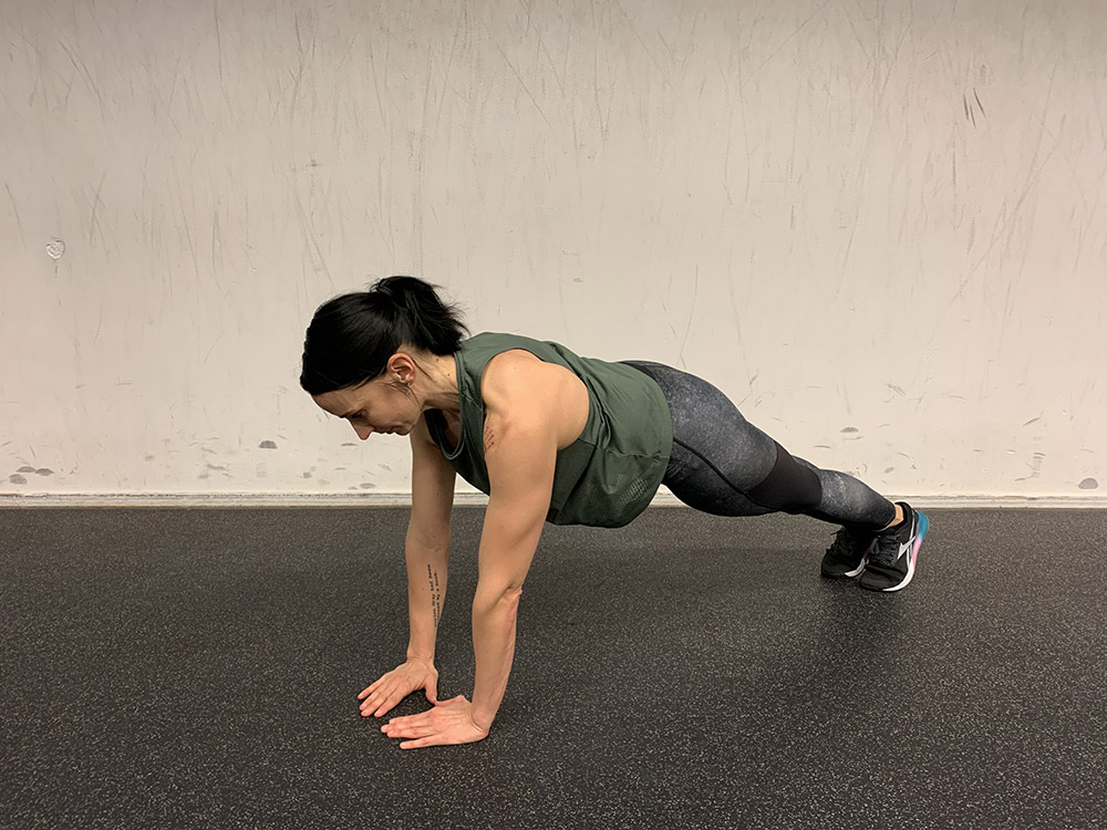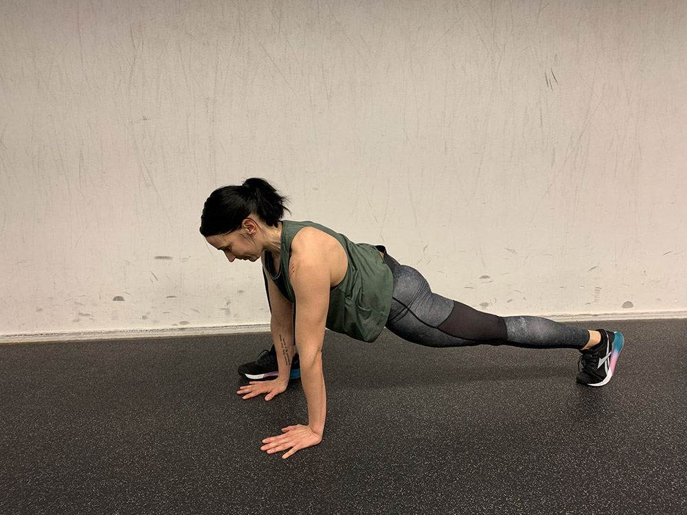 Tänk på: Det här är en tung armhävningsvariant. Om du inte orkar pressa dig upp med god form kan du sänka dig ner på händer och tår, sätta i knäna och pressa dig upp. Kom sedan upp på tå igen och sänk dig ner.