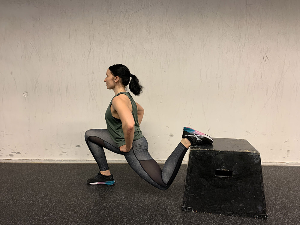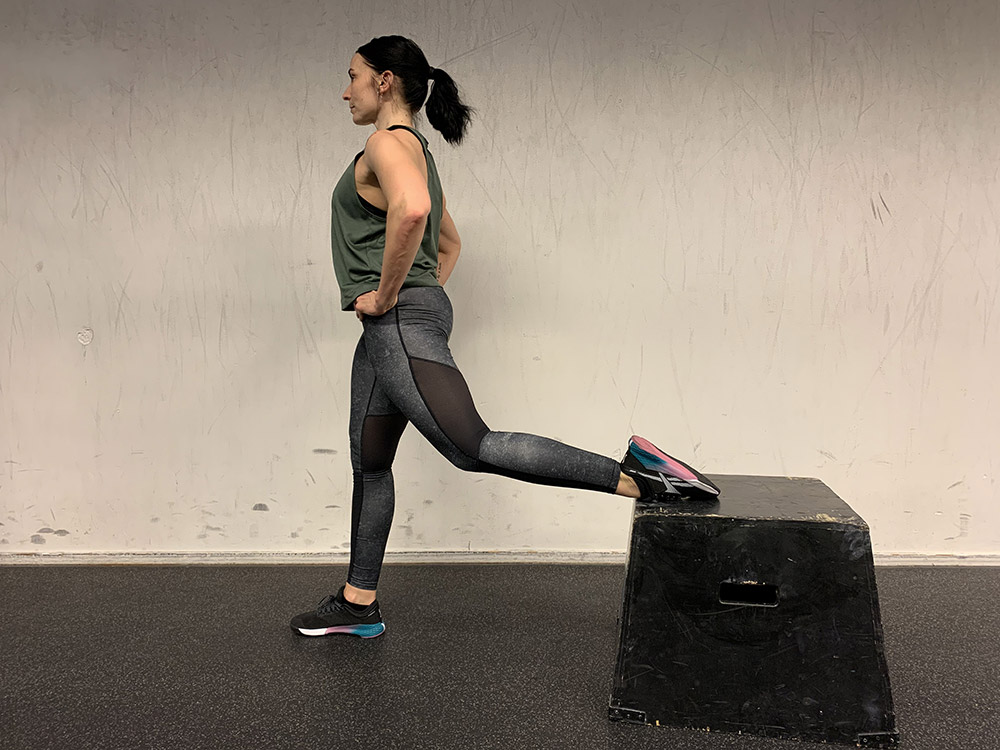 Gör så här: Stå några fotlängder framför en bänk eller stol och sätt upp vänster fot på bakom dig på bänken. Böj nu det främre benet djupt samtidigt som du låter överkroppen komma fram lite. Pressa dig upp igen.