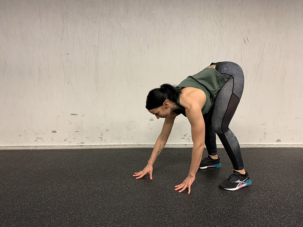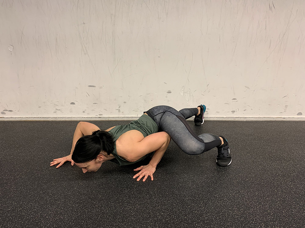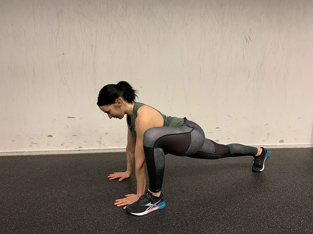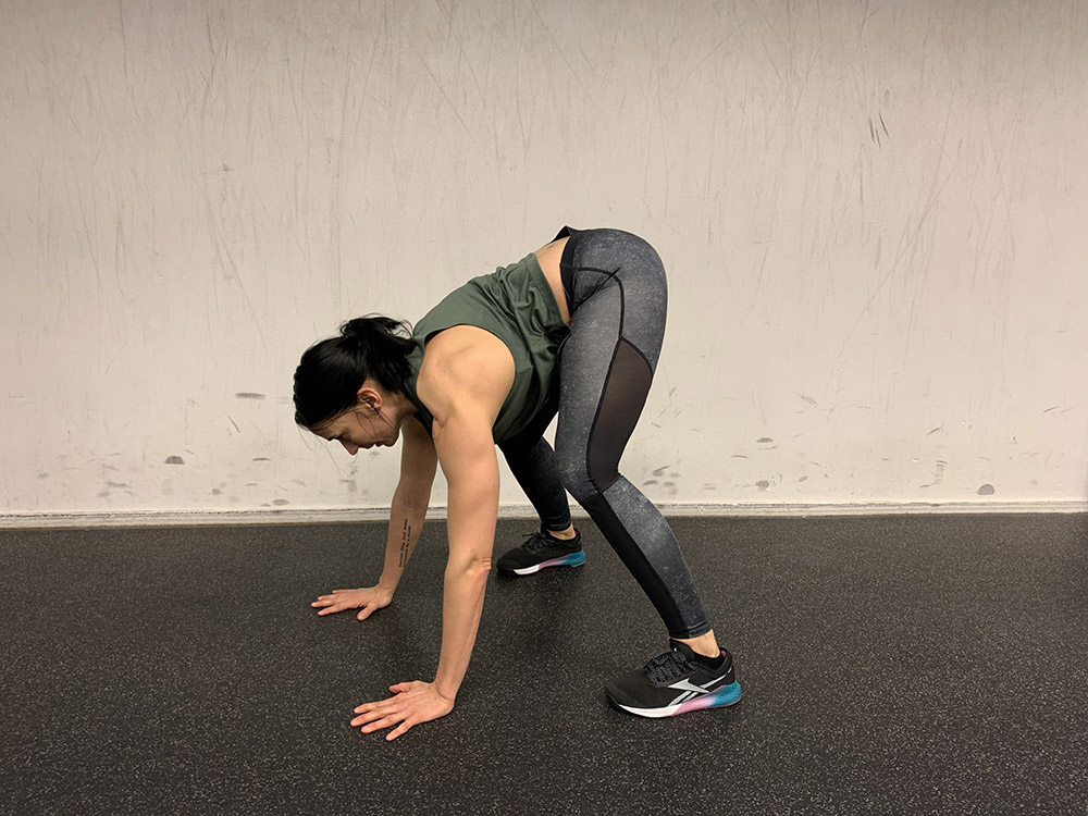 Gör så här: Sätt i händerna i golvet och hoppa samtidigt bak med fötterna och lägg dig så att både höft och bröst är i golvet. Skjut dig upp med hjälp av armarna och hoppa in med fötterna så nära händerna du kan. Res upp överkroppen och hoppa genast ner i ett utfallshopp. Hoppa upp och växla ben i luften och landa i ett nytt utfall. Hoppa ihop med fötterna och börja om.