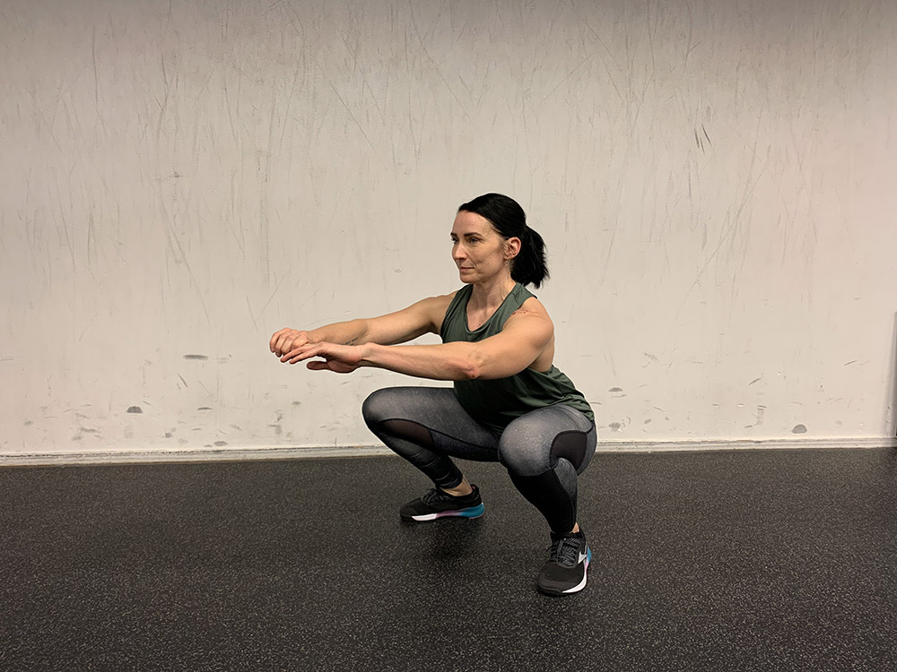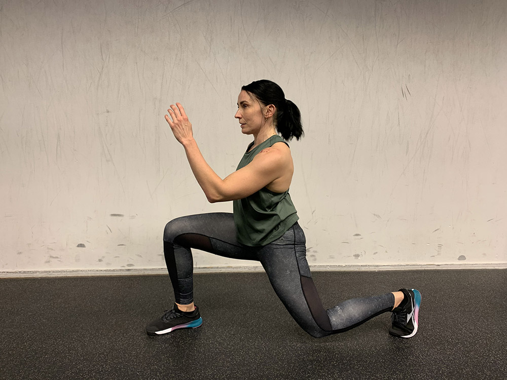 Gör så här: Stå axelbrett med fötterna och gå ner i en djup knäböj. Sträck fram höger ben rakt framför dig. Sätt tillbaka höger fot i golvet och res dig upp. Gå ner i en ny benböj och sträck fram vänster fot. Försök att få rörelserna smidiga så att du kan hålla ett ganska högt tempo.