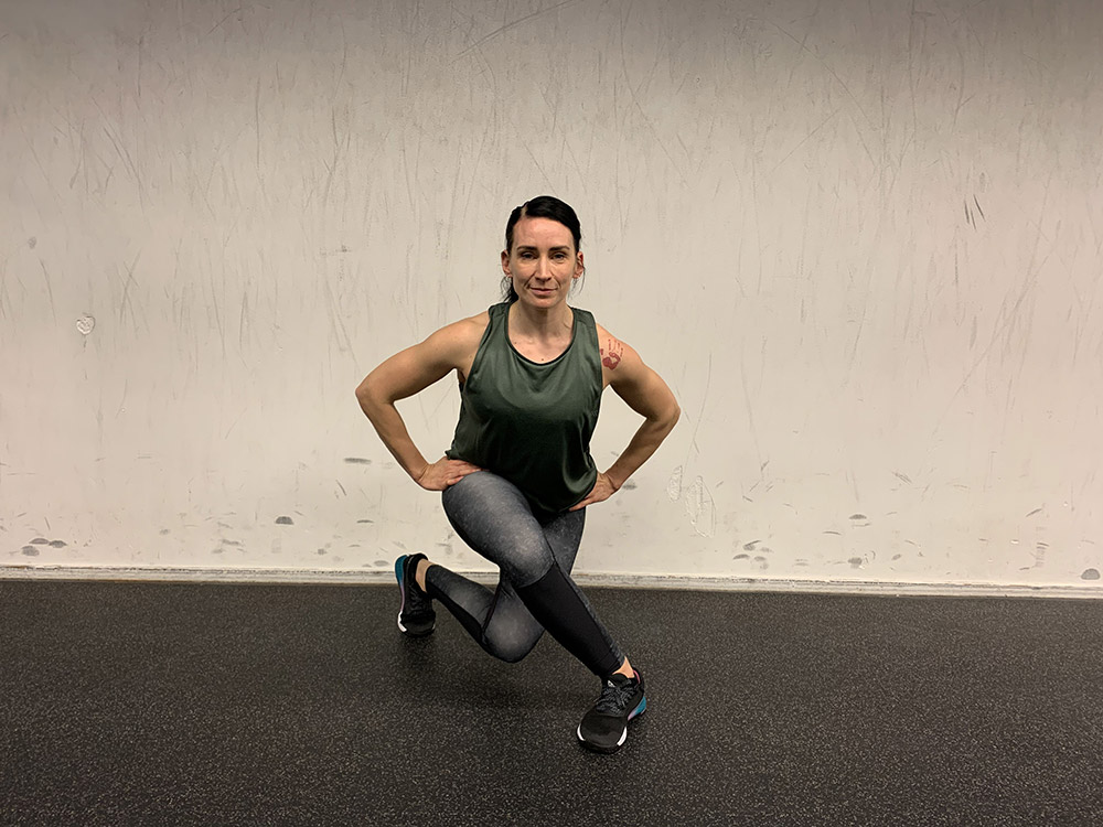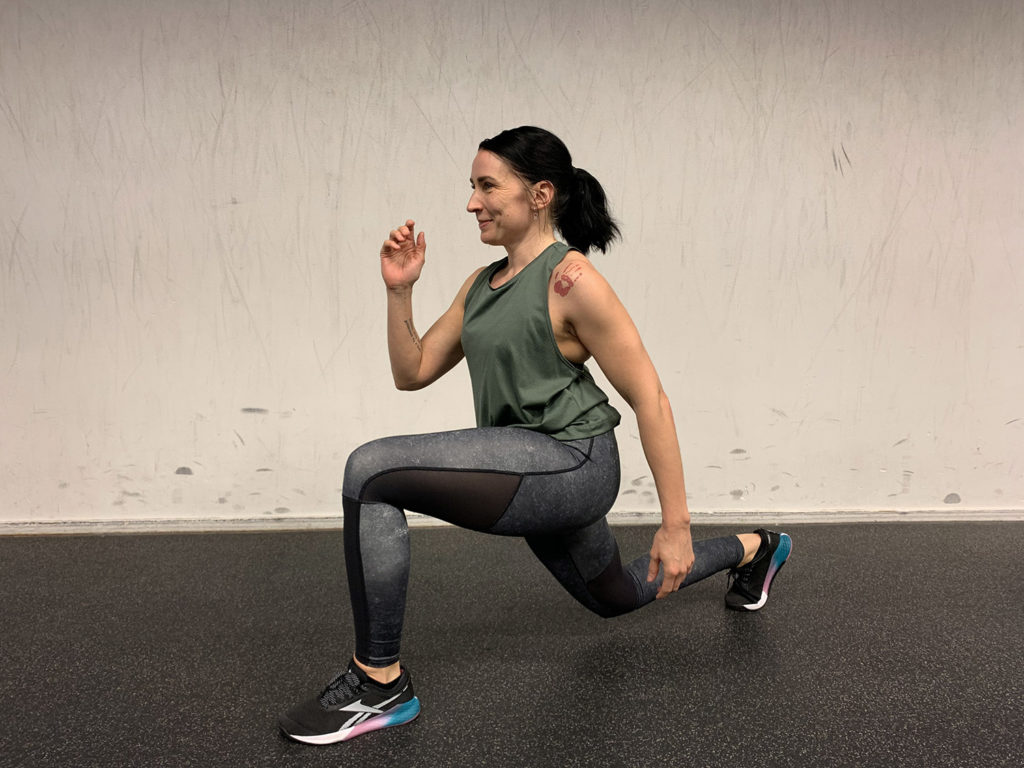 Gör så här: Ta ett kliv ut åt sidan med höger ben och kliv in bakom med vänster. Sjunk ner djupt, som att du niger. Luta gärna fram överkroppen lite. Pressa dig tillbaka upp och ta direkt ett kliv ut åt vänster istället och kom in bakom med höger ben.