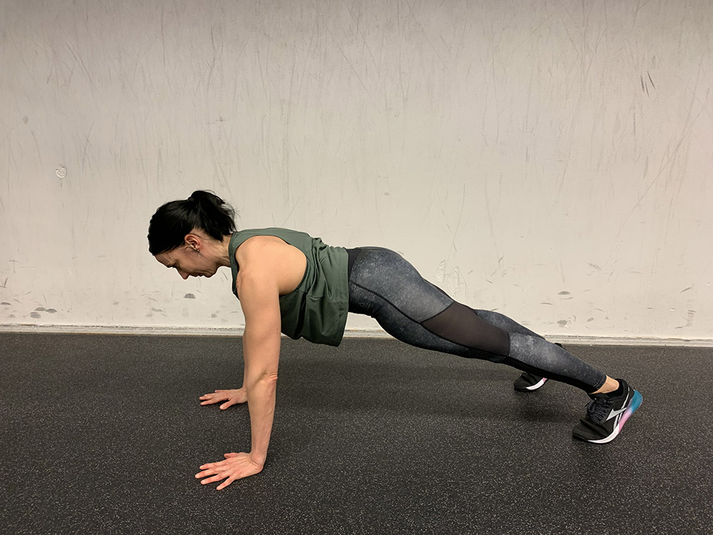 Tänk på: Om armhävning på tårna är för tungt kan du sätta ner knäna i golvet innan du gör armhävningen och sedan sätta tillbaka tårna i golvet igen. Du kan också utesluta armhävningen helt.