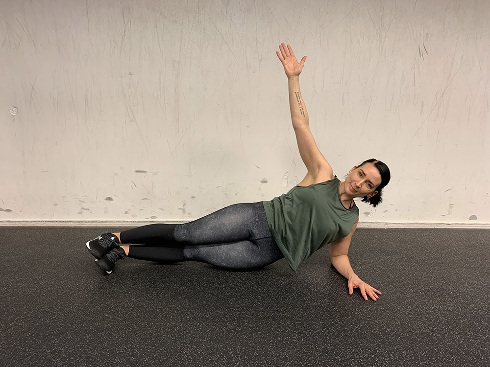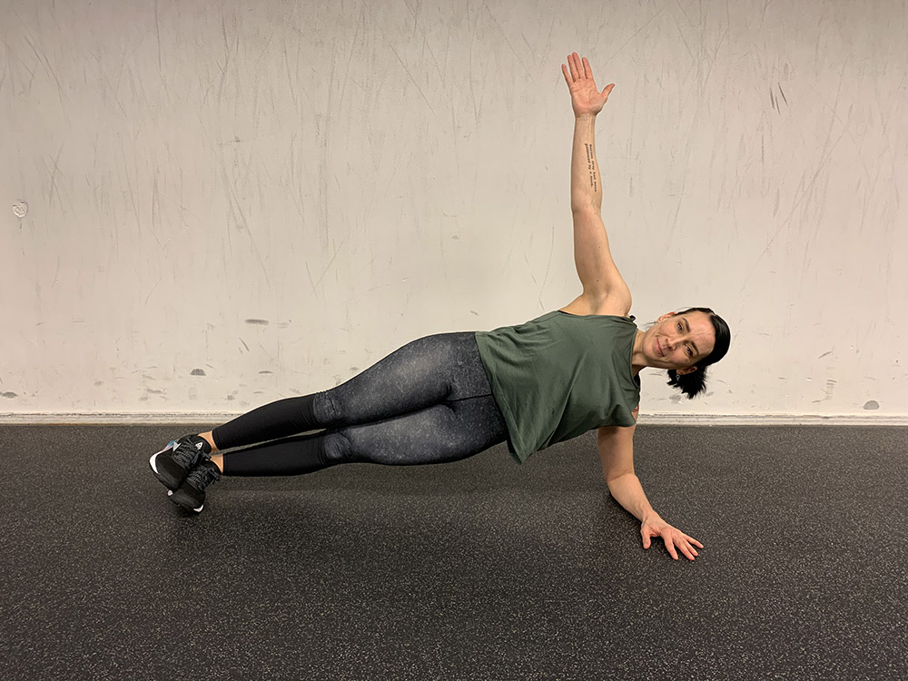 Gör så här: Stå i en sidoplanka med armbågen och fötterna i golvet. Sträck upp den övre armen mot taket. Dippa ner med höften mot golvet och vänd sedan direkt upp igen och tryck upp höften lite mot taket. Upprepa.