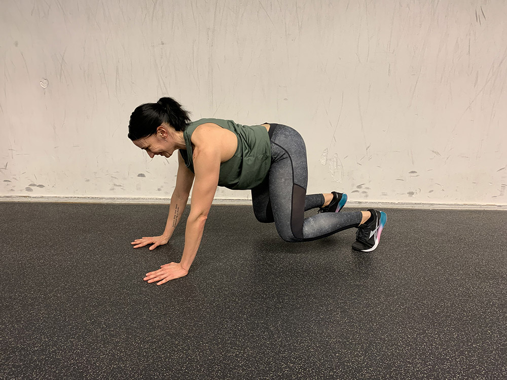 Gör så här: Börja på alla fyra men med knäna lyfta från golvet. Lägg över vikten på höger hand och tråckla fram höger ben under kroppen och sträck fram det framför dig. Tråckla tillbaka benet och lägg istället vikten på vänster hand och få fram vänster ben. Fortsätt att byta sida.