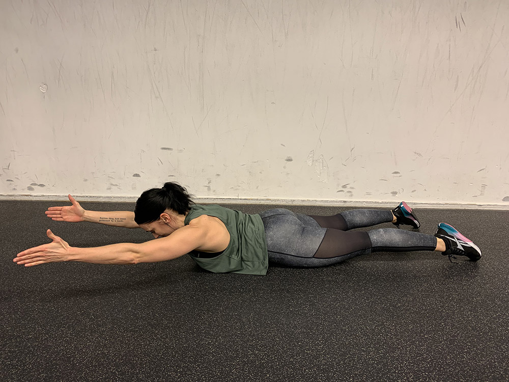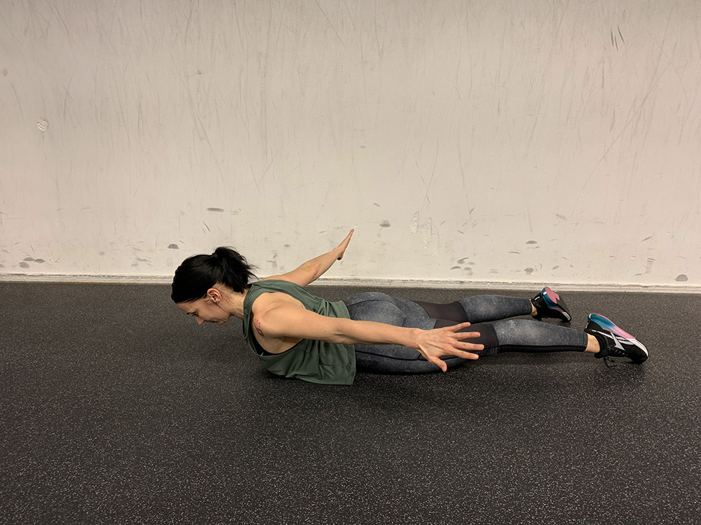 Gör så här: Ligg på magen med armarna rakt fram över huvudet. Lyft upp överkroppen lite samtidigt som du gör ett stort simtag med armarna. Sänk överkroppen igen och för samtidigt fram armarna igen och börja om.